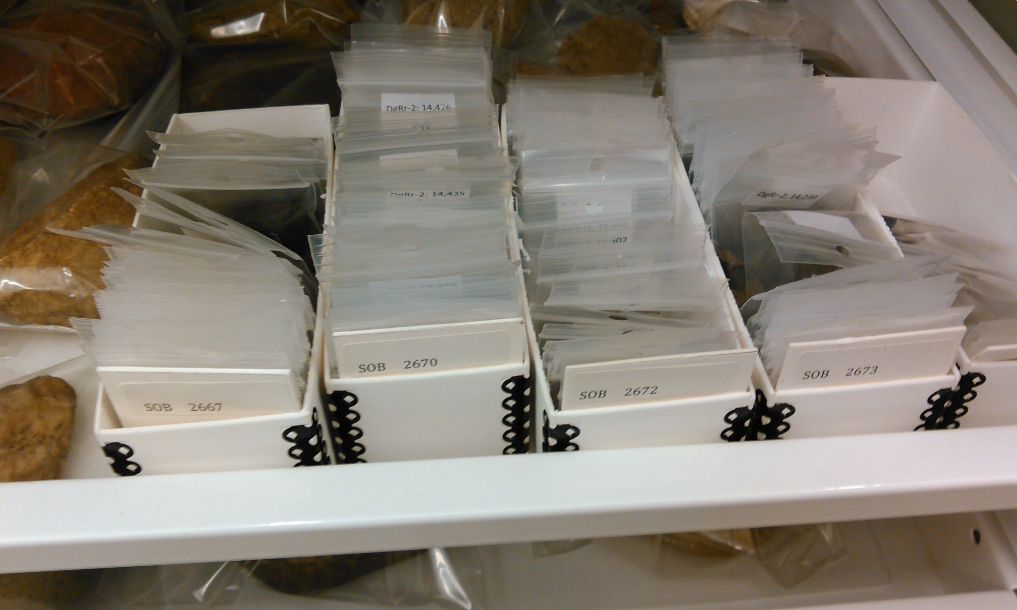 Collections storage at the MOA is impressive and elaborate. Each object has its own individually crafted mount and locations are tracked with barcodes. The Laboratory of Archaeology on the other hand has very little to no exhibition space. They carefully photograph every object for inclusion in their online catalog and individually bag and label each artifact. Their storage is no less impressive as artifacts are arrayed on compacting storage shelves with room for growth. This is the type of collections storage that I aspire to – but we have a long way to go!