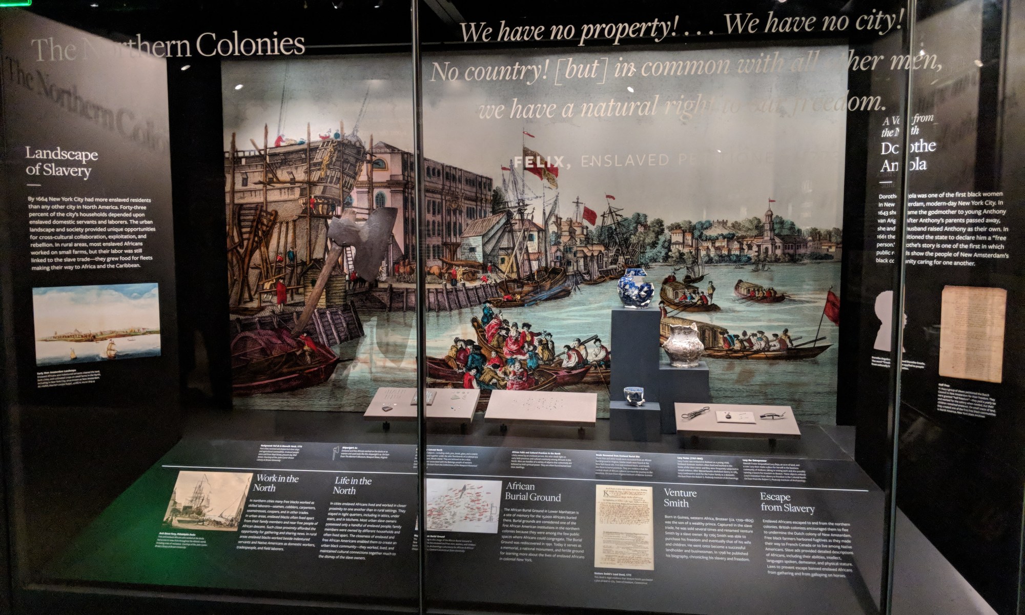 The Lucy Foster site objects are displayed in Slavery and Freedom in “The Northern Colonies: Expanding Merchant Capital” section of the museum. These objects allow the NMAAHC to tell the story of women and their work in the north and bring to light the personal voice and story of Lucy Foster. Foster was born in Boston in 1767 and was sold into the household of Job and Hannah Foster at age four, in 1771. She worked as a domestic in their household until Job’s death in 1789, when she moved with Hannah to her new husband Philemon Chandler’s household. After Chandler’s death, they moved back to the Foster household until Hannah’s death in 1815. Lucy then established her own household on land willed to her by Hannah. Lucy died of pneumonia on November 1, 1845. Occasional mentions of Lucy in historical documents, coupled with the archaeological remains, has allowed a glimpse into her life.