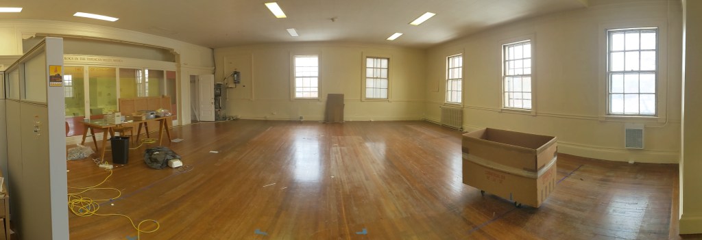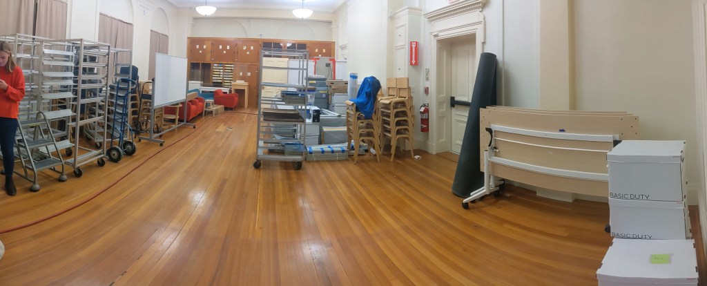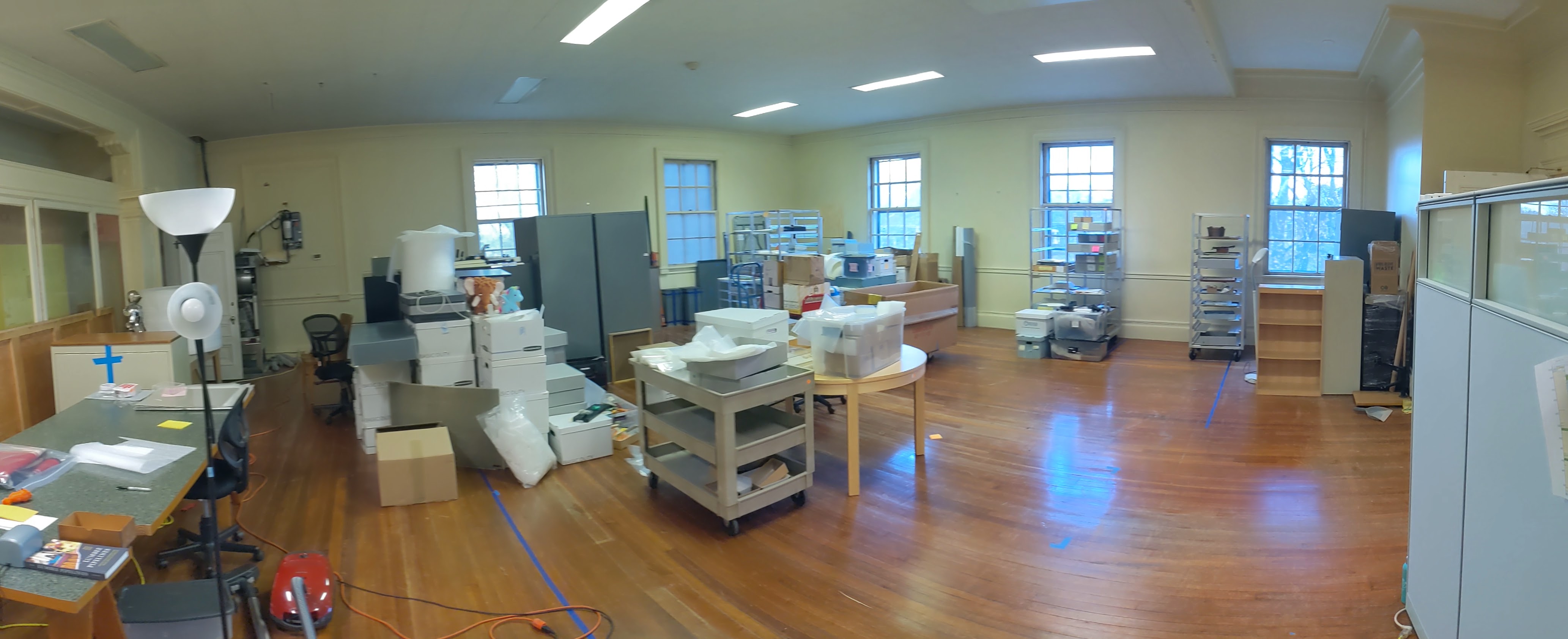 With construction in our building slated to start this month we have been busy packing up the Peabody. The collections are staying onsite in the recently renovated basement, but everything else that isn’t nailed down from the first floor through the attic has been moved to our temporary office in George Washington Hall (known on campus as “GW”) or to an offsite storage facility.