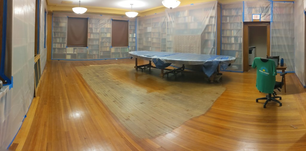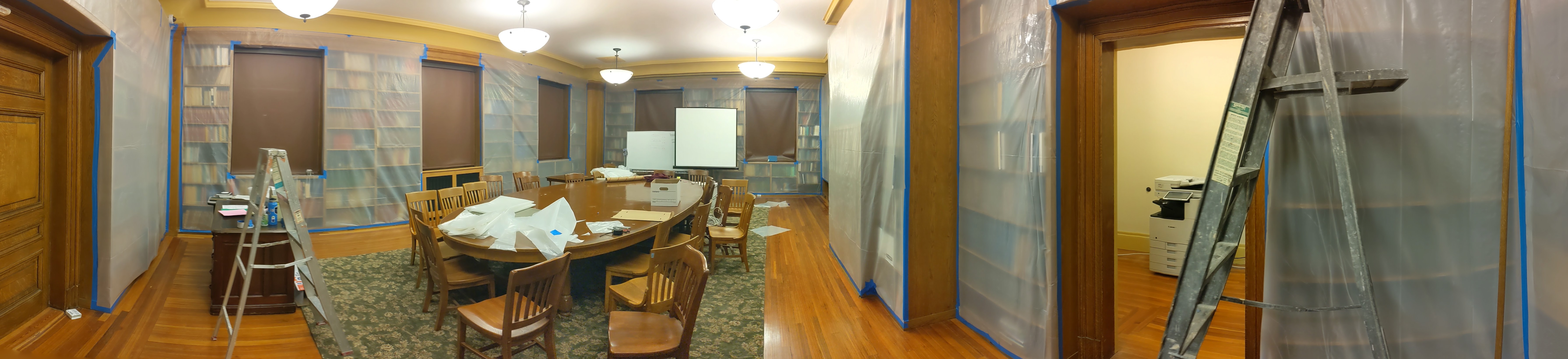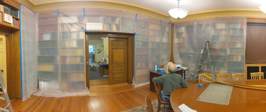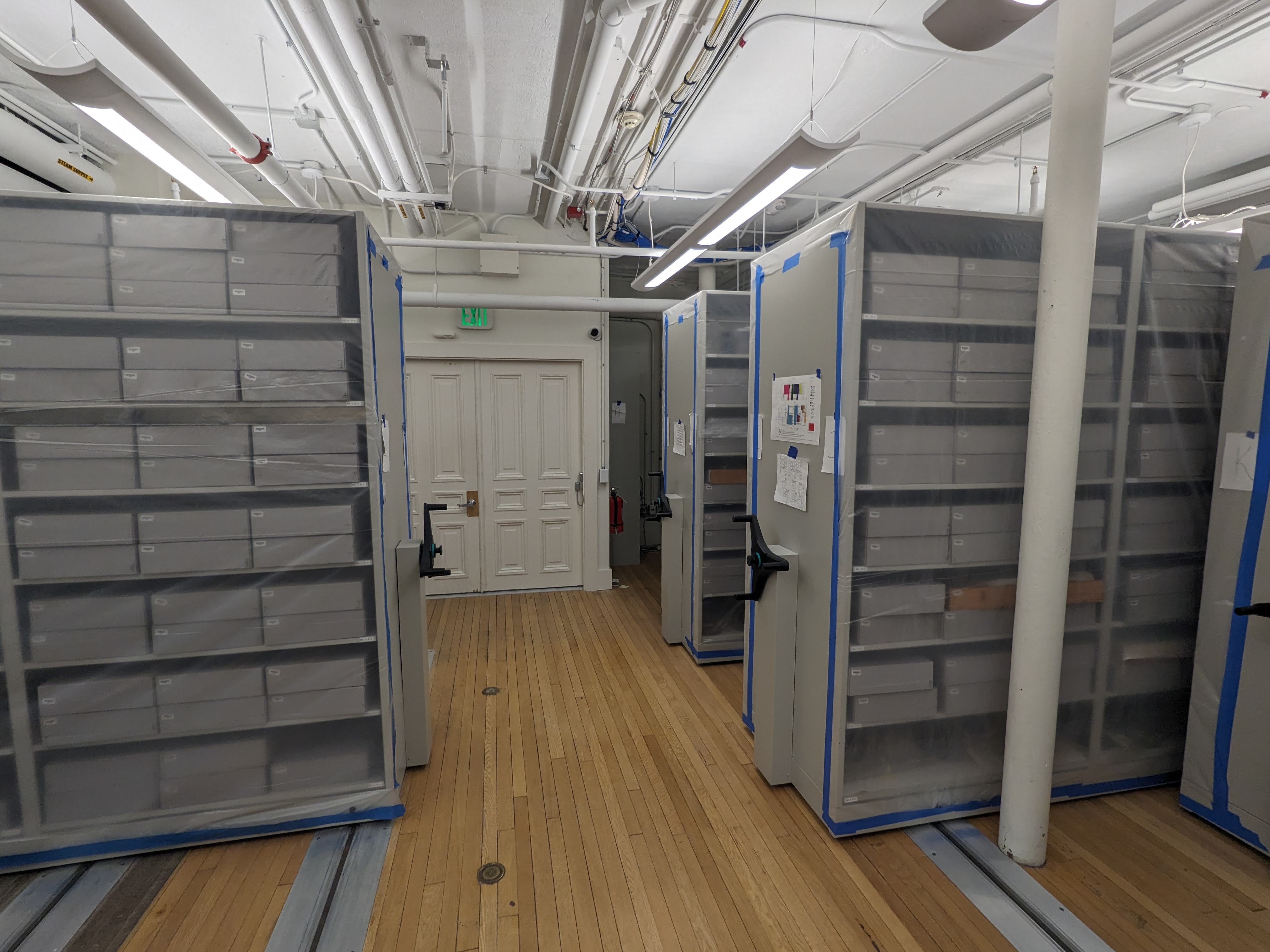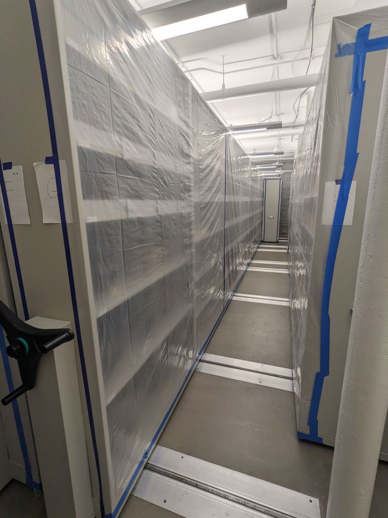 In addition to packing, we have taken steps to protect the collections during construction. Though very little construction is planned in the basement, renovations in the rest of the building will inevitably result in dust and small bits of debris in the collections areas. To keep everything clean, and avoid weeks of post construction cleaning, we have covered the metal shelving in plastic sheeting. The library has been prepared in a similar fashion.