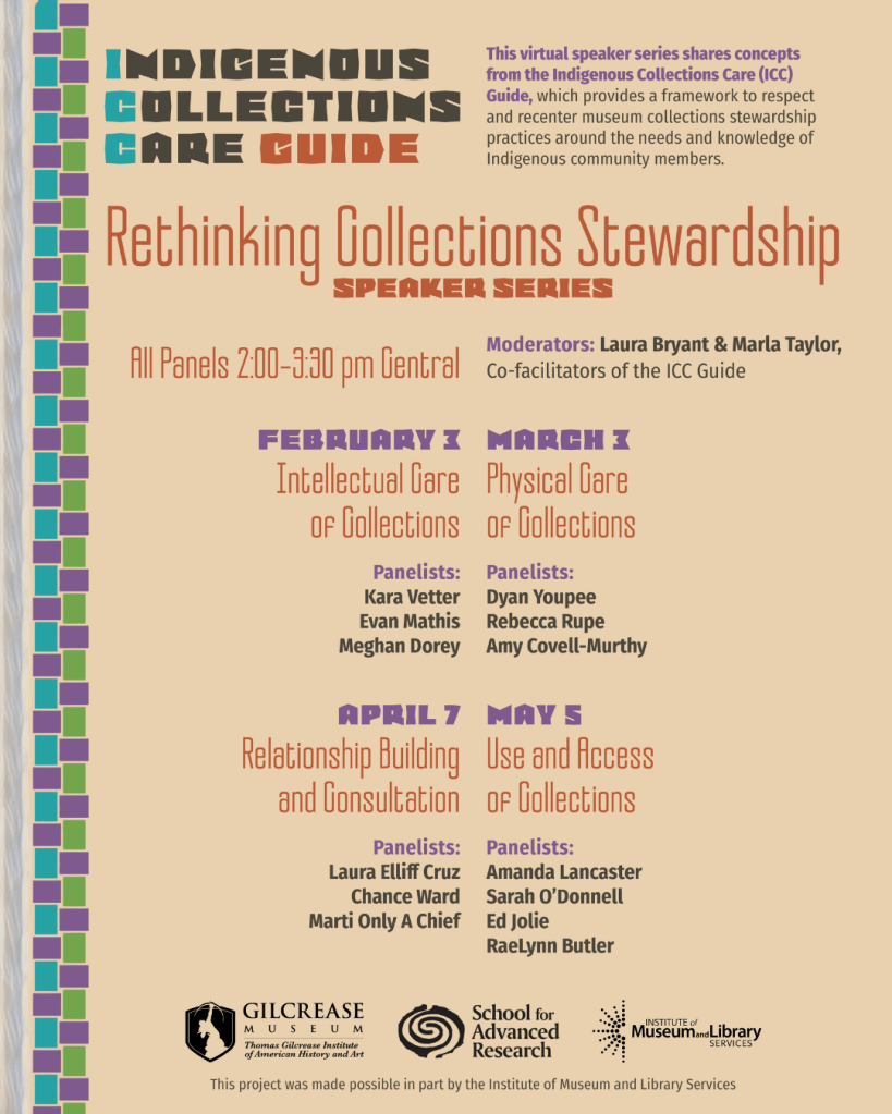 My co-facilitator and I regularly speak about the development and content of the ICC Guide – at conferences, to classes, and as part of a speaker series we developed. The Rethinking Collections Stewardship Speaker Series is hosted by the Gilcrease Museum in collaboration with SAR. We planned for four panels that center on the key content areas within the guide – Intellectual Care of collections, Physical Care of collections, Relationship Building and Consultation, Use and Access of collections.