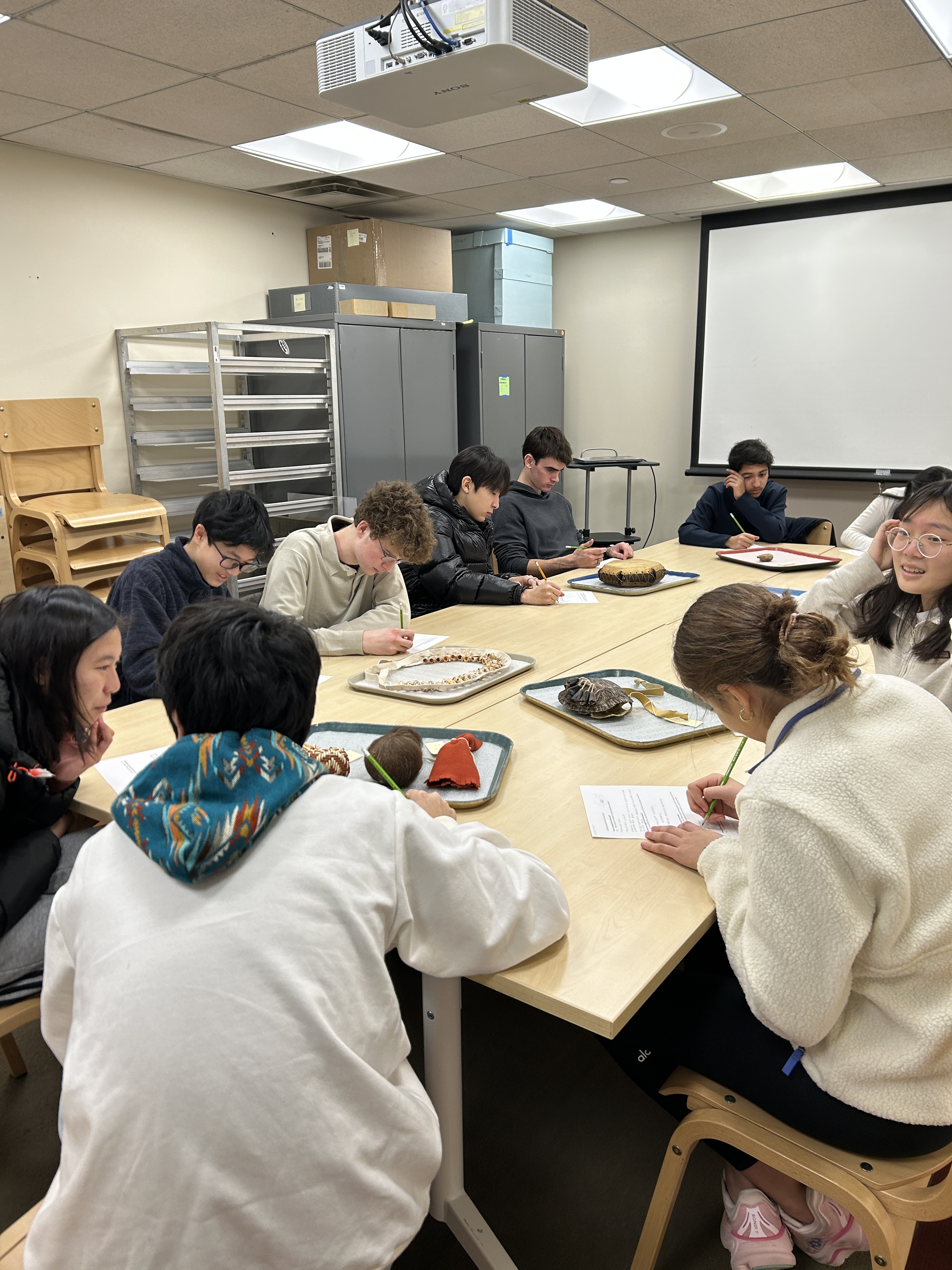 Or – could it be a meeting room for classes? Lore tells of Peabody staff moving into the School Room on the Abbot Academy campus for the first phase of building renovations. To continue teaching classes, staff valiantly packed up boxes of collections, carrying them from classroom to classroom along with all their teaching supplies: gloves, ethafoam, trays, and, goodness help them, laptops.