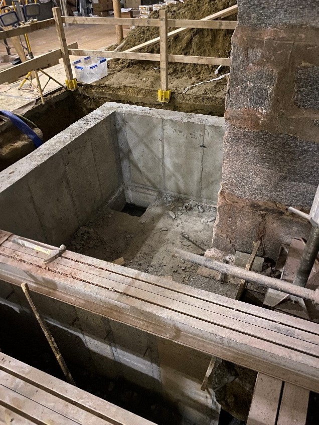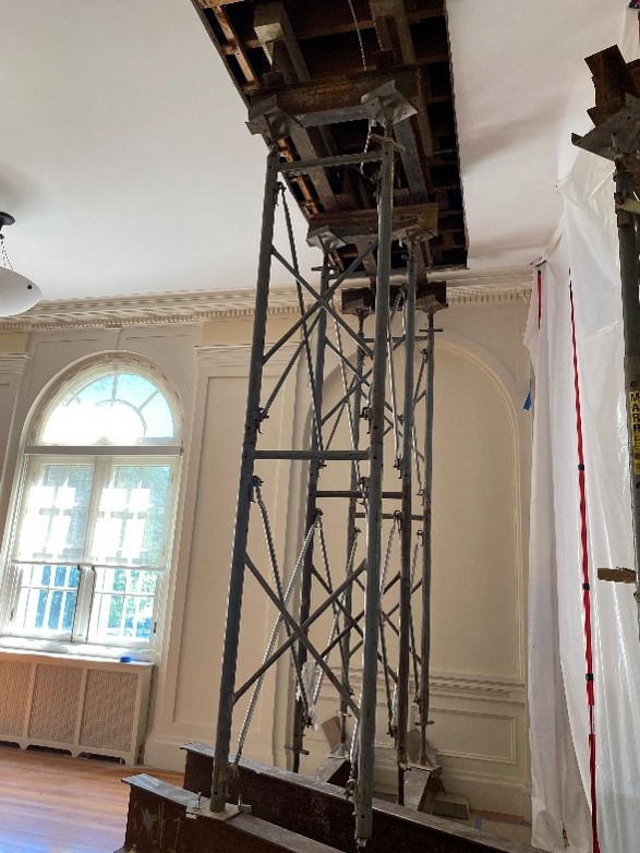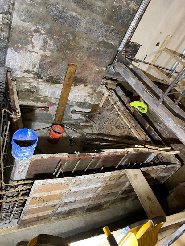 The biggest changes can be seen around the installation of the elevator. A giant hole has been excavated in the basement. Seriously, I had no idea how deep those shafts needed to go. Steel support beams have been added on the first and second floors before the floors are removed.