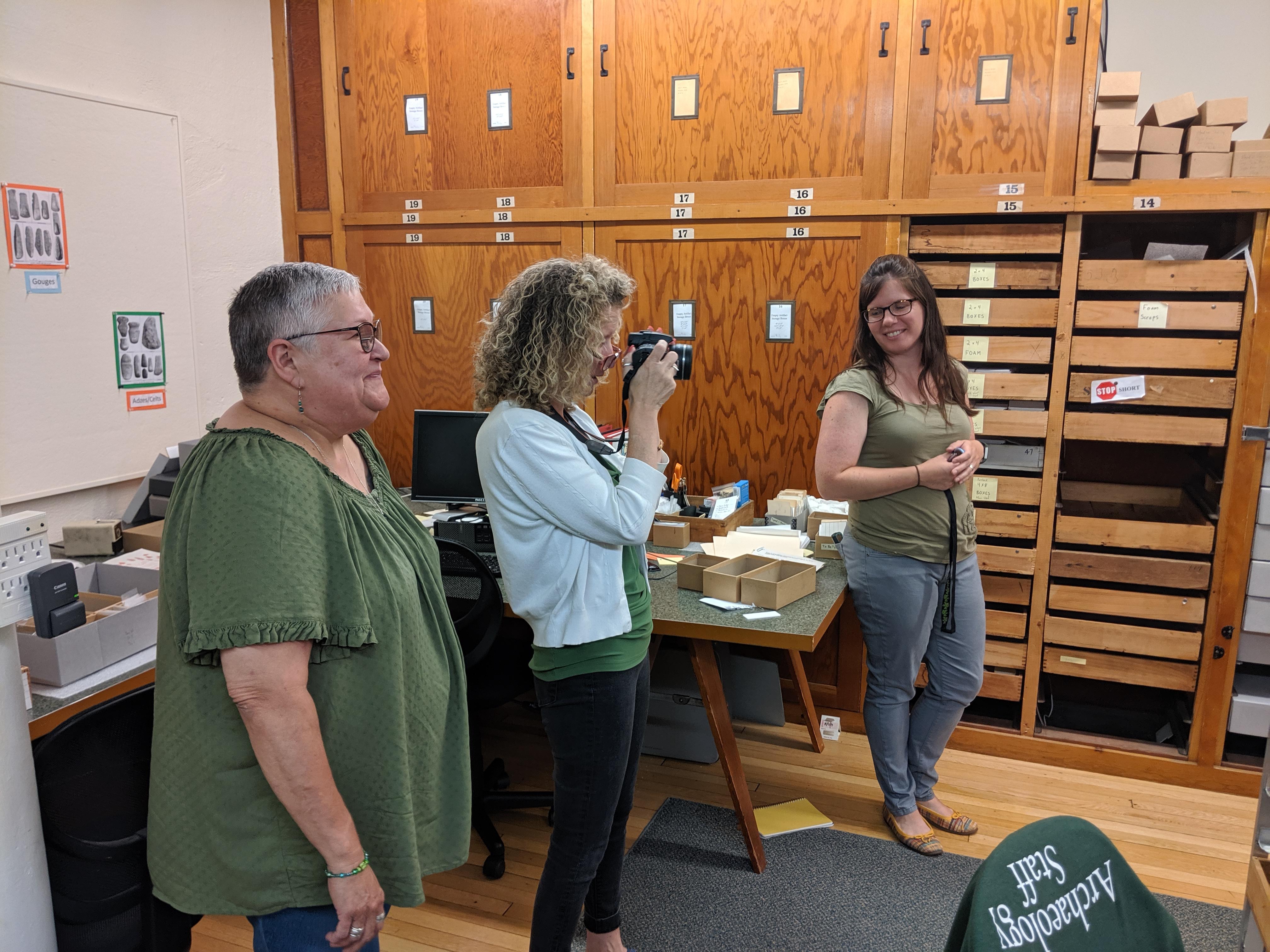 Marla Taylor (right), Peabody curator of collections, with Nekole Alligood (left) and Susan Bachor, representatives of the Delaware tribes, during a consultation meeting.