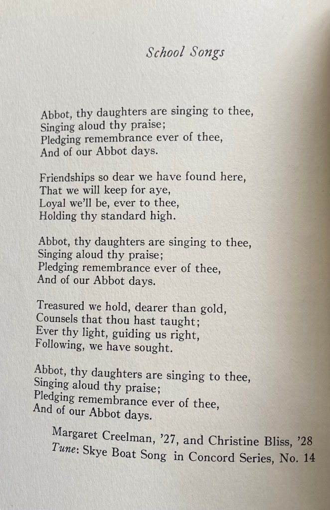 In additon to all the wonderful and candid photographs that decorate the walls in Abbot Hall, my favorite find was an Abbot Academy Song Book. This book is filled with a variety of school songs, marches, sport songs, serenades and salutes, rounds, parting hymn, and Bradford songs remembered by past Abbot Academy alumni. What really brought this find full circle for me was listening to past Abbot Academy alumni sing these songs during our 2023 reunion weekend.