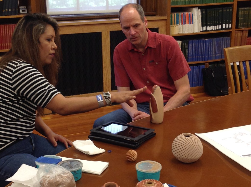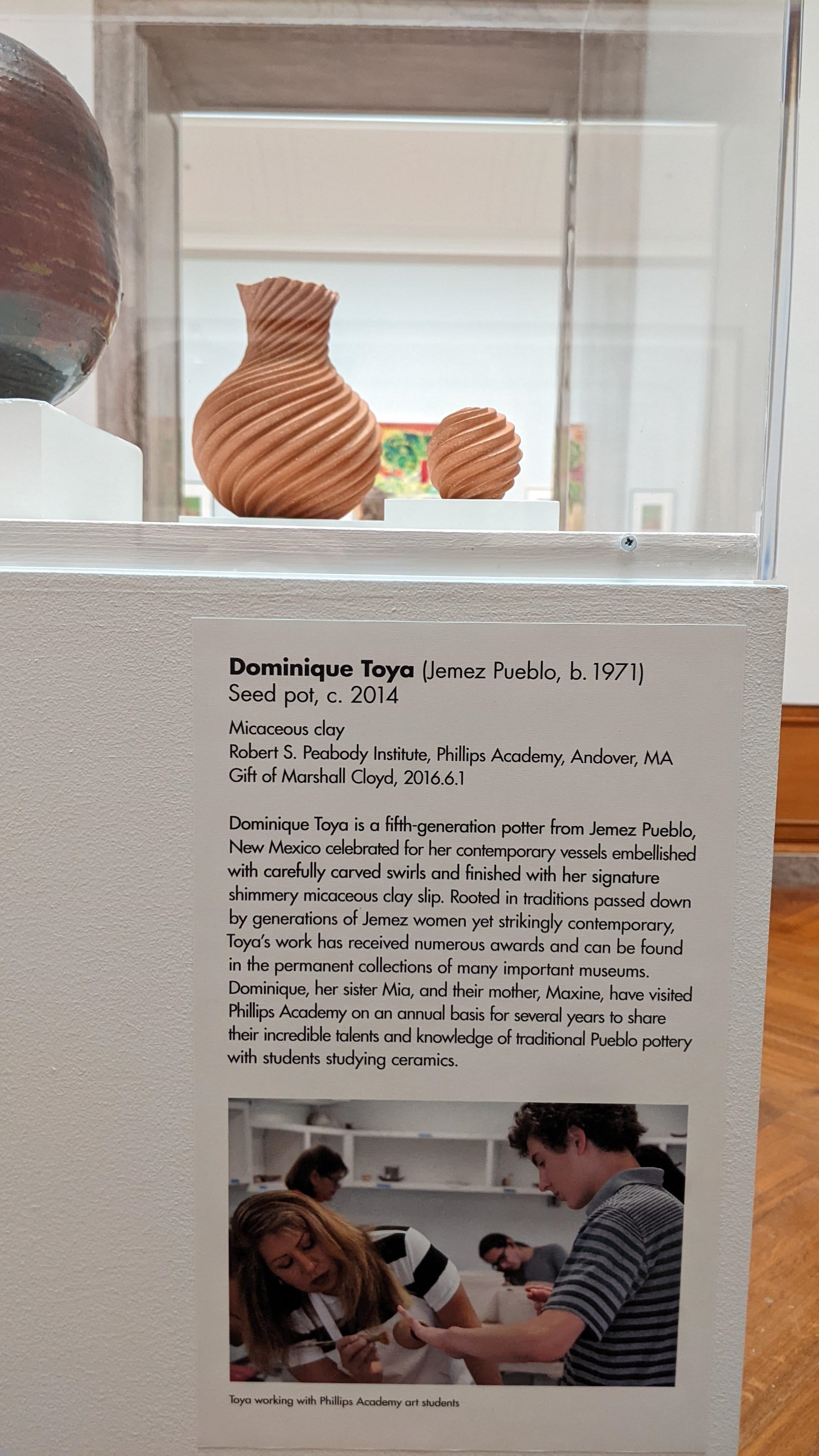 Early this fall–just after Santa Fe Indian Market–we were fortunate to add to the Peabody Institute collections this lovely melon swirl vessel by Mia Toya (Pueblo of Jemez). Mia and her family have a long relationship with the Peabody and Phillips Academy, regularly coming to campus to conduct week-long workshops on Pueblo pottery making with students in Thayer Zaeder’s studio ceramics classes.