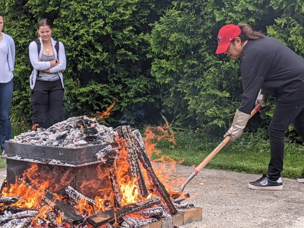 Dominique tends the open air pottery firing at the end of May 2022’s weeklong workshop as students look on.