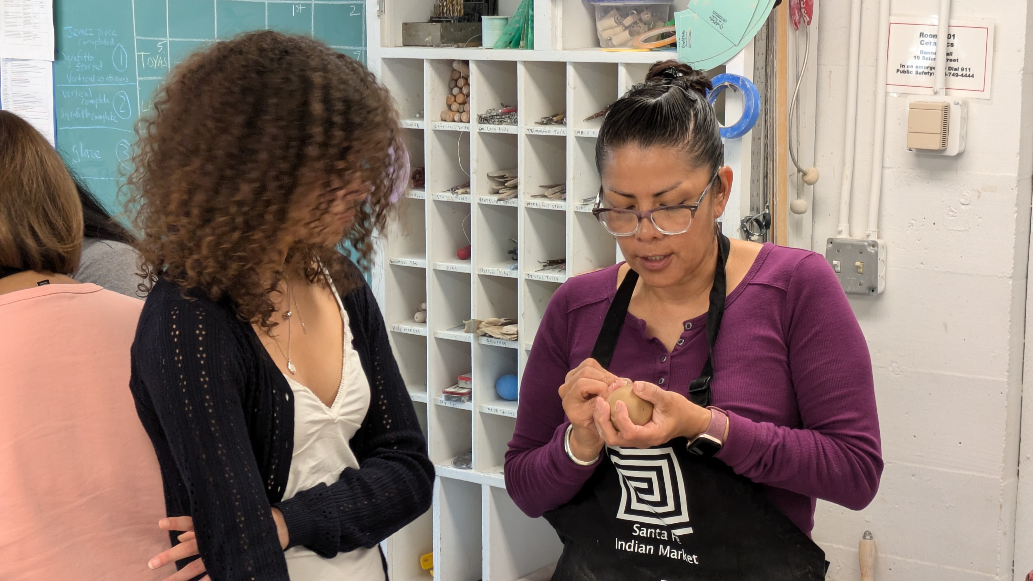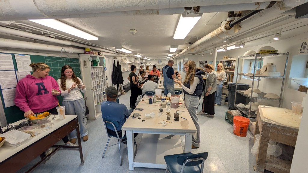 Mia helps a student perfect their piece in Thayer Zaeder’s campus ceramics studio, May 2024.
