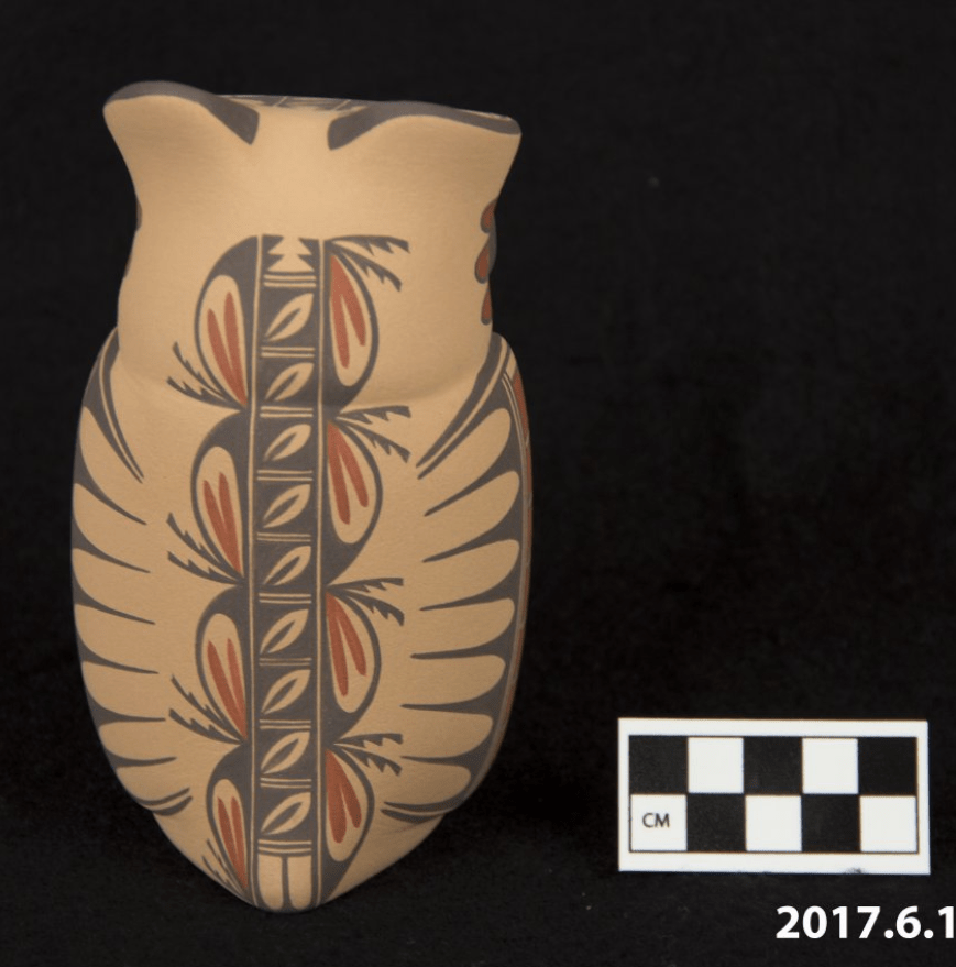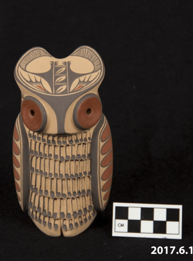 Ceramic Owl Figurine (2017.6.1) – Ceramic piece by Maxine Toya from the Pueblo of Jemez, New Mexico. In Pueblo culture, owls are seen as protectors. The ceramic owl design is built by stacking and smoothing hand coils of clay. The piece is both carved and painted, the feathers on the front being carved into the clay. Painted designs are intricate using symbols of rain, clouds, and feathers. These designs are all matte and painted with clay slips with only the eyes being polished.