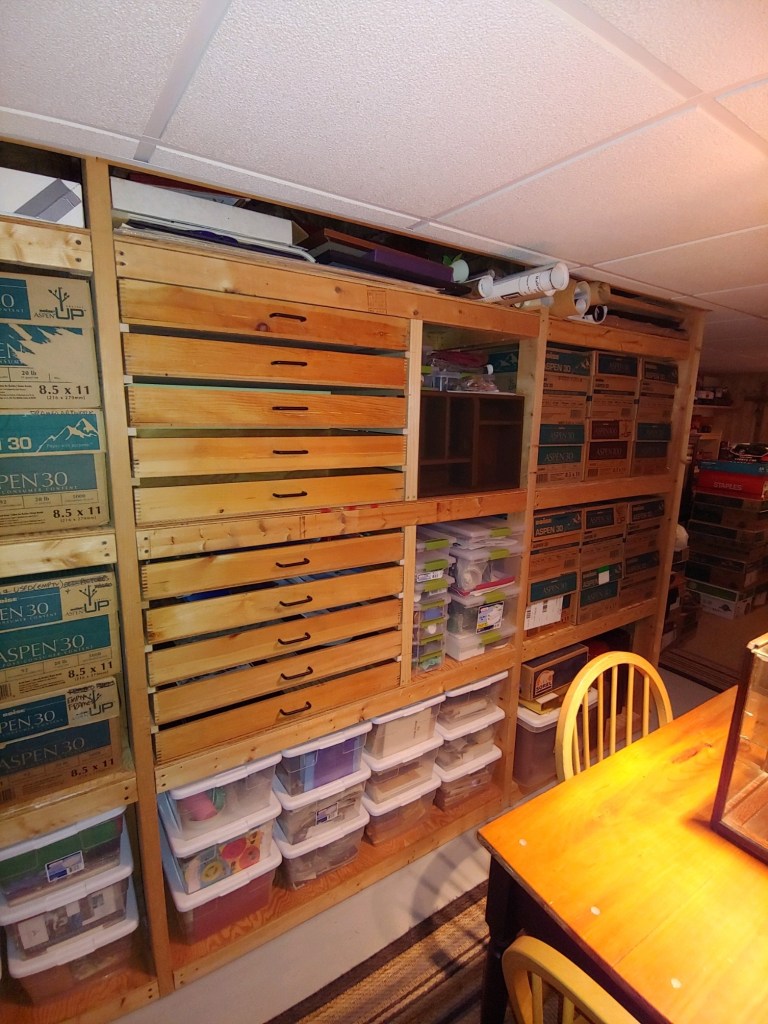 The large drawers are great for holding large items or large quantities of smaller items. Add handles and they make a perfect storage feature for your household. These drawers are being used to store artwork. What a great way to stay organized with a little piece of history!