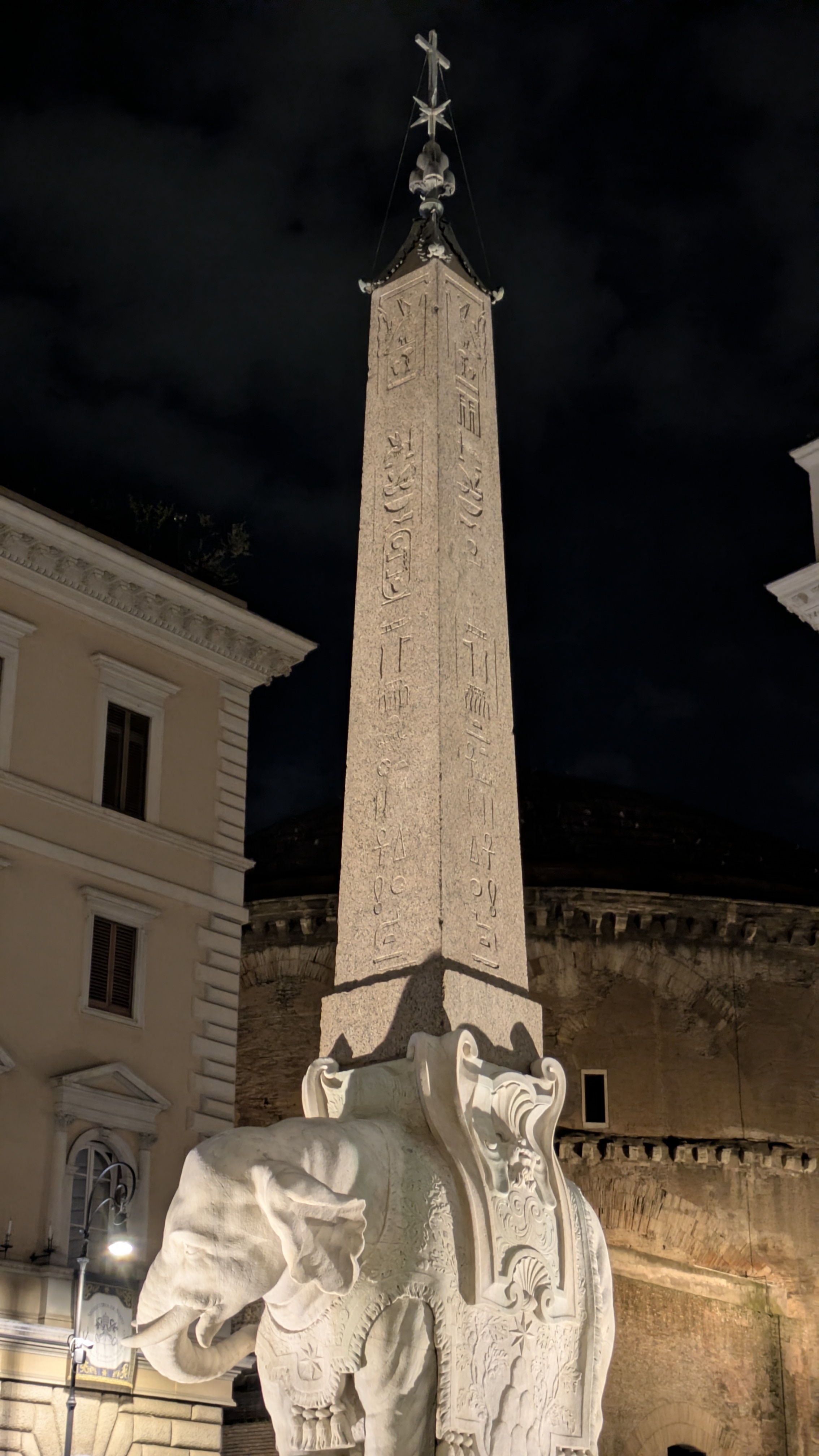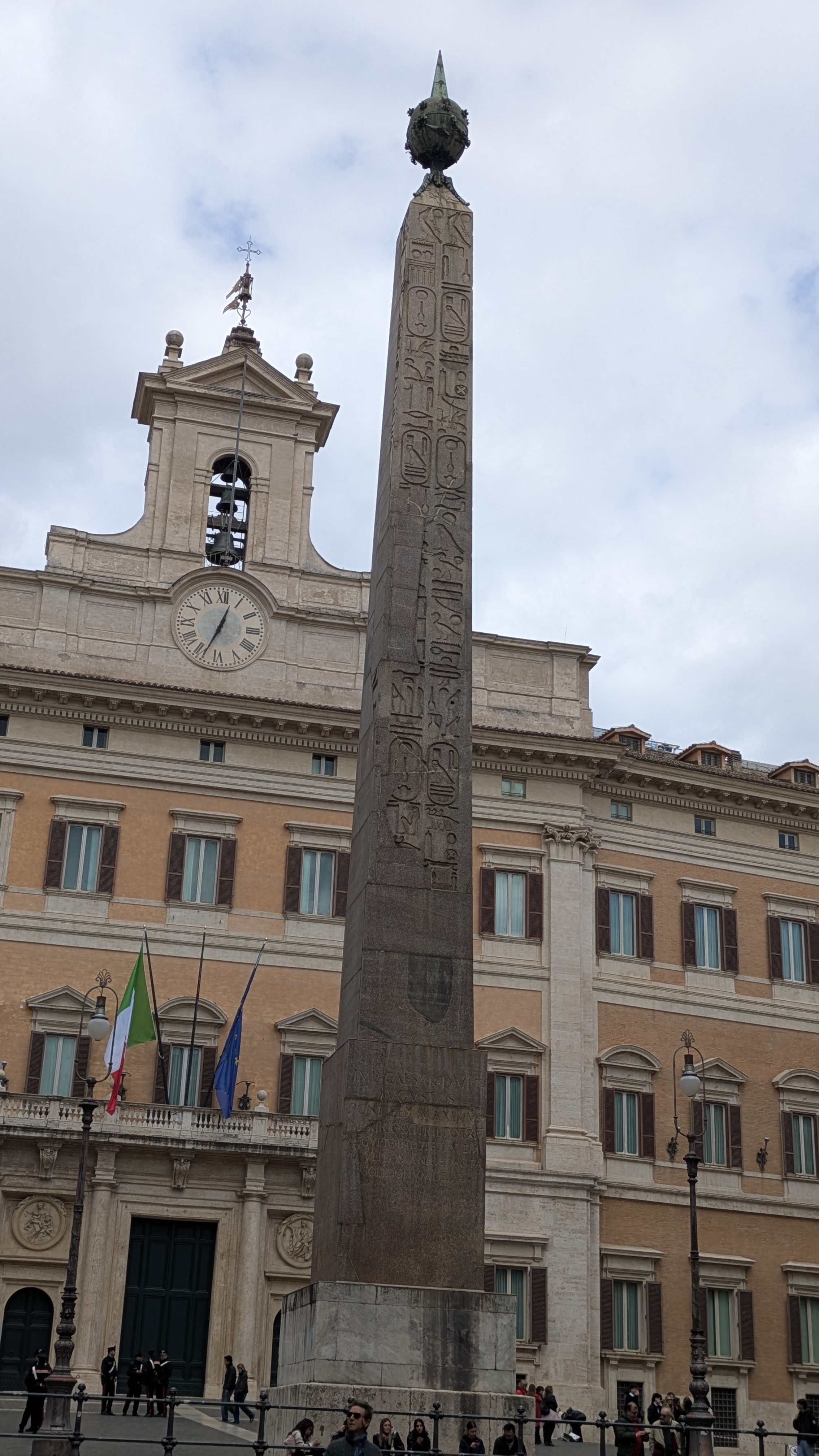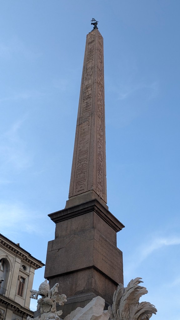 Not far from where we stayed—and in the Piazza della Rotonda—right in front of the Pantheon—we encountered an Egyptian obelisk. Apparently, there are around twelve or thirteen obelisks throughout Rome, some Roman recreations of Egyptian architecture, others actually brought from Egypt. The one by the Pantheon is covered in hieroglyphics, including cartouches that link it to Ramses II.