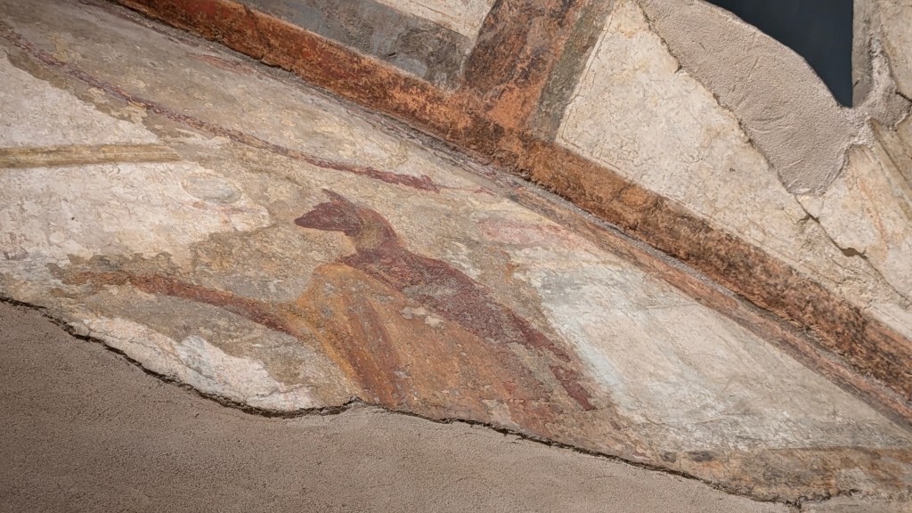Many of the ancient obelisks had been parts of temples, removed and reset in later times. We also got a sense of just how pervasive Egyptian art, architecture, and deities were in ancient Rome with a glimpse at a fresco showing Anubis, the jackal-headed Egyptian god of death, in the ruins of a Roman house pre-dating the construction of the Baths of Caracalla by several hundred years.