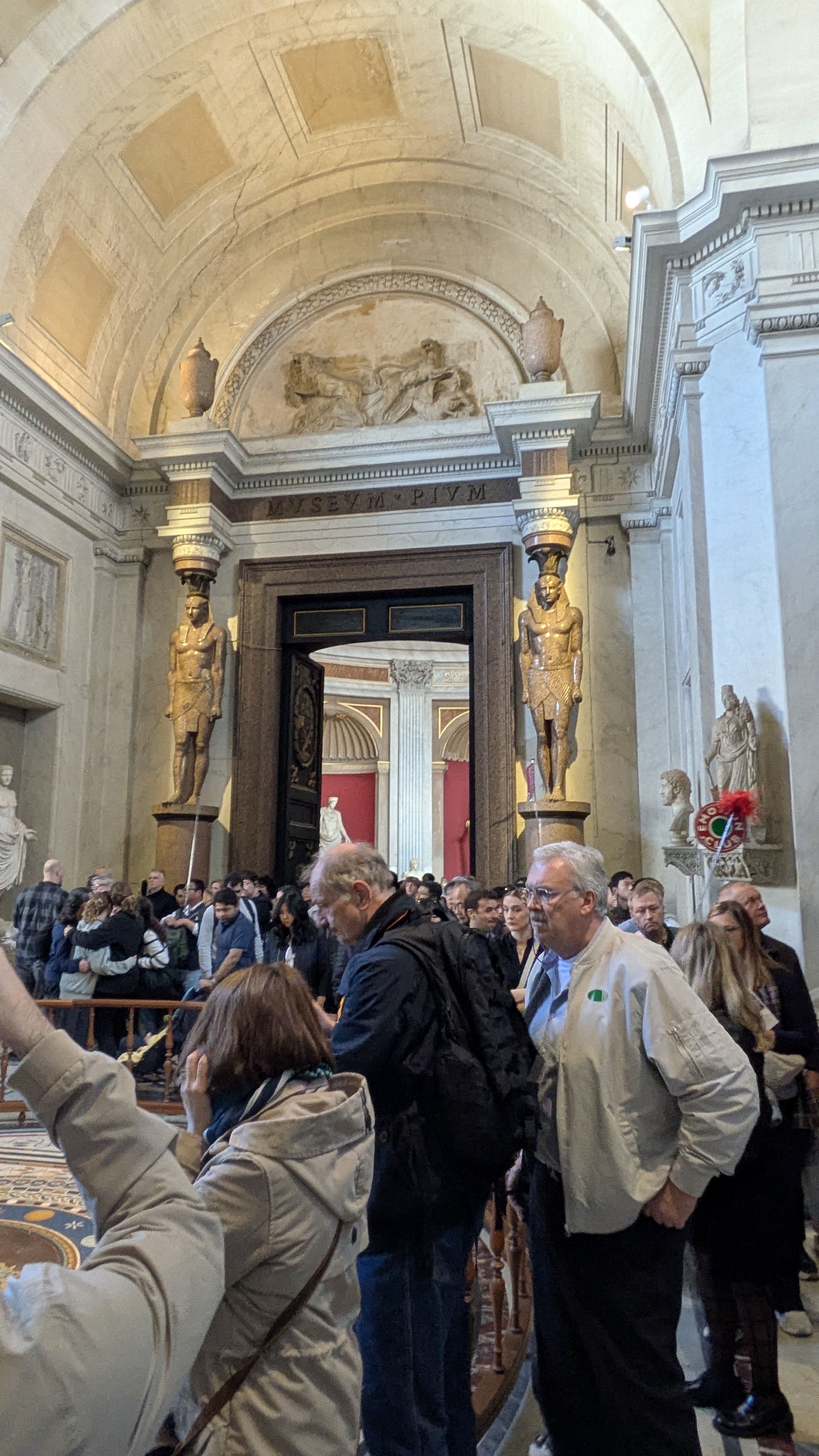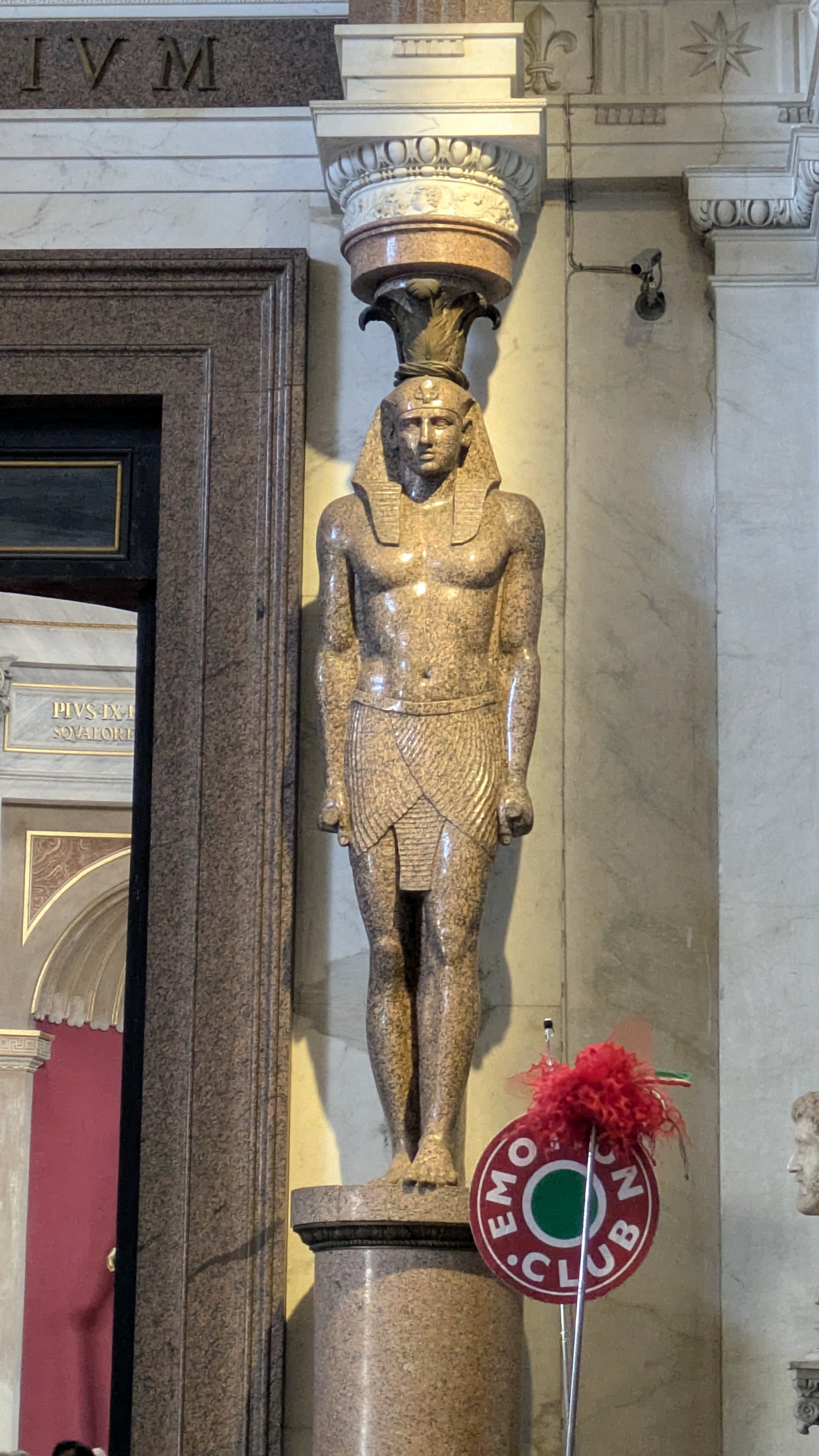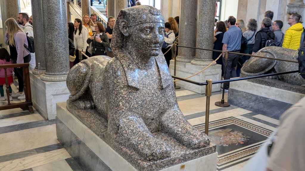 Sadly, time did not permit a tour of the Egyptian gallery at the Vatican Museums, but we did spot several interesting pieces of Egyptian statuary as we pushed through the crush of humanity along with the other 35,000 daily visitors. I was particularly taken with a pair of Egyptian style pillar-statutes in the Greek Cross Hall. You can tell these are Roman copies of Egyptian artwork by their pose—the first century Romans went for symmetry, alternating right and left feet forward, while the Egyptian convention dictated the left leg forward.