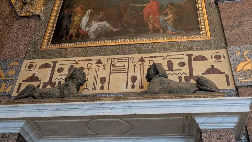 Egyptian influences continued well into later periods, as evident in the late eighteenth century Egyptian Room in the Galleria Borghese, which includes non-sensical hieroglyphic decoration, lots of red granite, Egyptian style ornamental architecture, and Greco-Romanized Egyptian gods in the ceiling frescoes. So, not only was Egypt an inspiration to the ancient Romans, but borrowing designs, materials, and items continued for a long time!